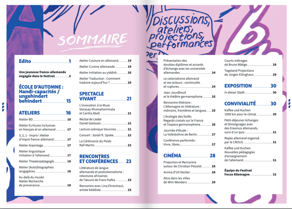Le festival est ouvert à tous : lycéens, étudiants, enseignants-chercheurs, artistes et autres curieux, germanophones & germanophiles. N’hésitez plus, en suivant les instructions du programme de la semaine FOCUS, à vous inscrire aux différents événements dont certains ont un nombre de places limité.